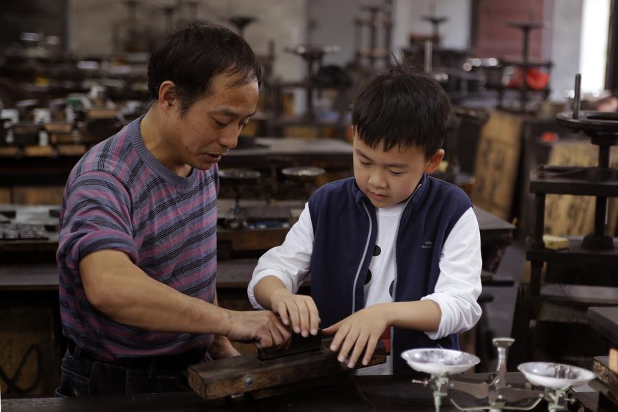 Zhou Mo (R) , the son of Huangshan city-level Huizhou Ink making inheritor Zhou Jian, makes an ink stick under the guidance of a worker at a workshop of the Ancient Hu Kaiwen Ink Factory in Shexian County, Huangshan City of east China's Anhui Province, Oct. 24, 2023. (Xinhua/Zhu Weixi)