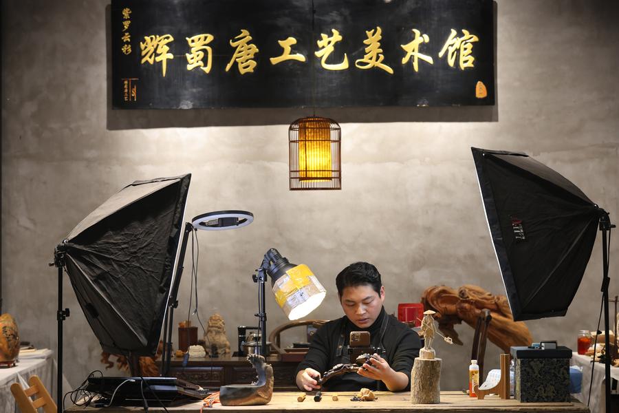 Tang Shuhui, a municipal-level inheritor of Huizhou woodcarving, promotes woodcarving artworks via livestreaming at his studio in Shexian County of Huangshan, east China's Anhui Province, Dec. 14, 2023. (Photo by Fan Chengzhu/Xinhua)