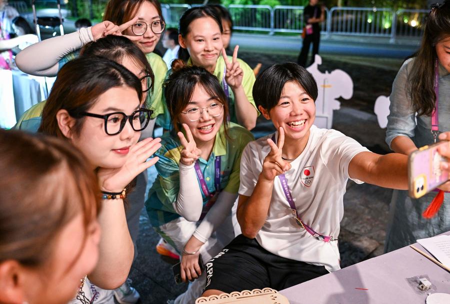 A Japanese athlete (1st R) takes a selfie with volunteers at a workshop for traditional crafts experience at the Asian Games Sub-village in Chun'an, east China's Zhejiang Province, Sept. 25, 2023. (Xinhua/Hu Huhu)