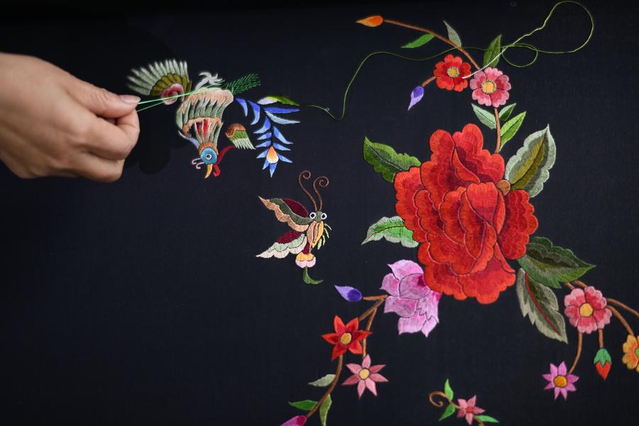 A woman of Miao ethnic group makes embroidery at a workshop in Shibing County of Qiandongnan Miao and Dong Autonomous Prefecture, southwest China's Guizhou Province, Nov. 13, 2023. (Xinhua/Yang Ying)