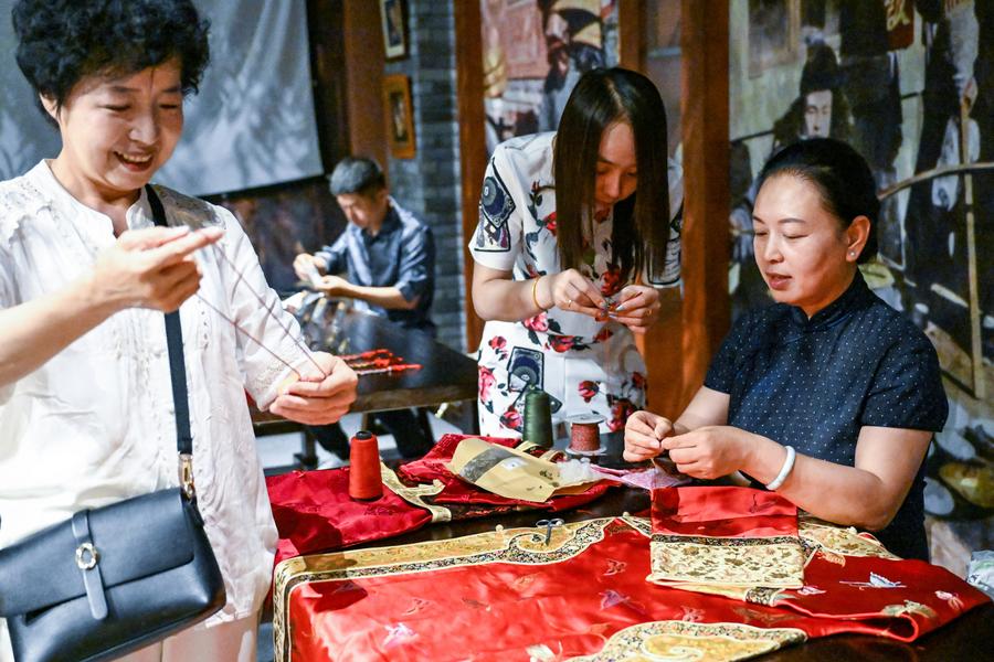 Chen Yuqiu, an inheritor of the national-level intangible cultural heritage of Manchu cheongsam making, teaches people to make sachets at the Jilin Museum in Jilin, northeast China's Jilin Province, June 19, 2023. (Xinhua/Yan Linyun)