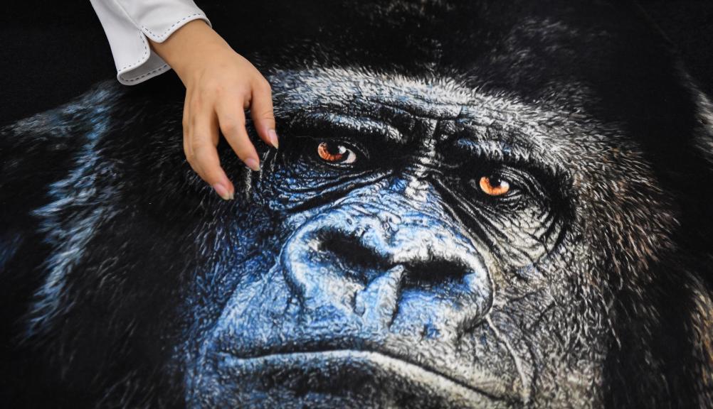 Wang Xinyuan makes a piece of Guangzhou embroidery artwork on gorilla at his studio in Liwan District of Guangzhou, south China's Guangdong Province, April 4, 2023. (Xinhua/Deng Hua)