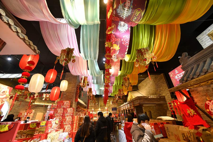 Customers visit a Spring Festival fair themed on intangible cultural heritage in Fengrun District of Tangshan, north China's Hebei Province, Jan. 12, 2023. (Xinhua/Mu Yu)