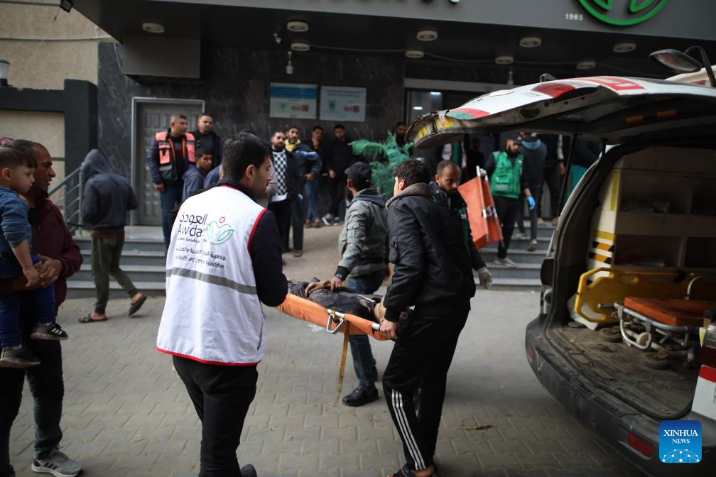 An injured man is transferred to a hospital near Nuseirat Refugee Camp, central Gaza Strip, on Dec. 28, 2023. The number of Palestinian deaths due to Israel's attacks on the Gaza Strip has risen to 21,320 with 55,603 injured, said the Gaza Health Ministry on Thursday. (Xinhua)