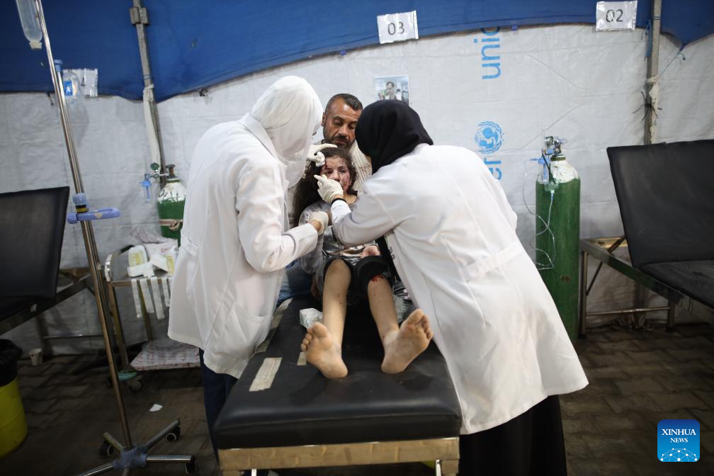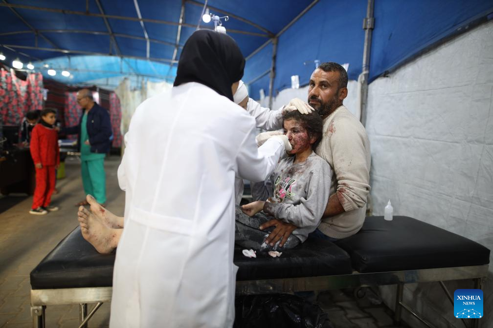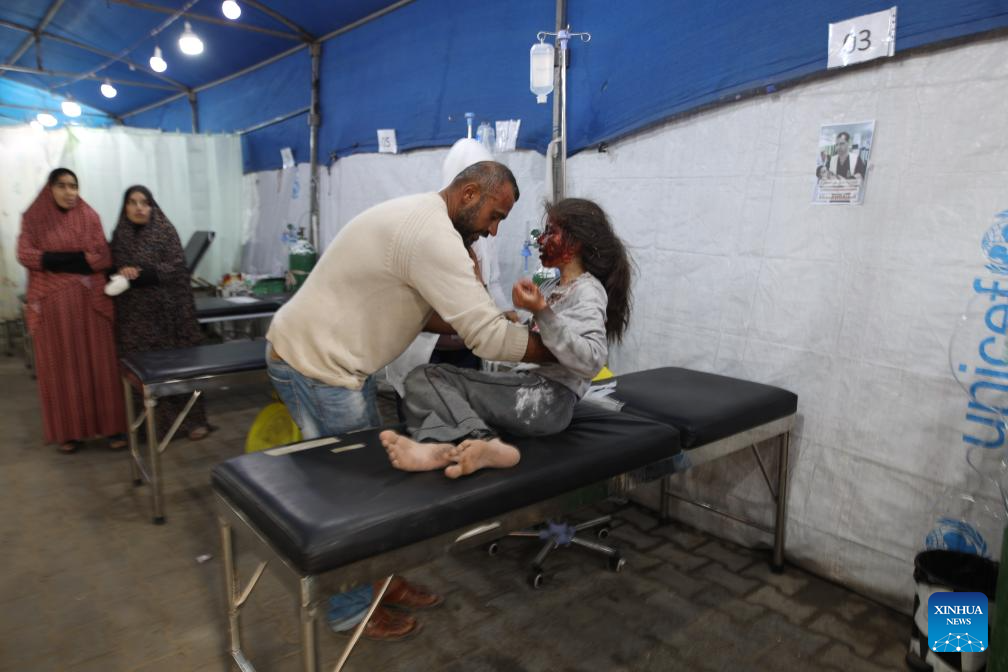 An injured girl is treated at a hospital near Nuseirat Refugee Camp, central Gaza Strip, on Dec. 28, 2023. The number of Palestinian deaths due to Israel's attacks on the Gaza Strip has risen to 21,320 with 55,603 injured, said the Gaza Health Ministry on Thursday. (Xinhua)