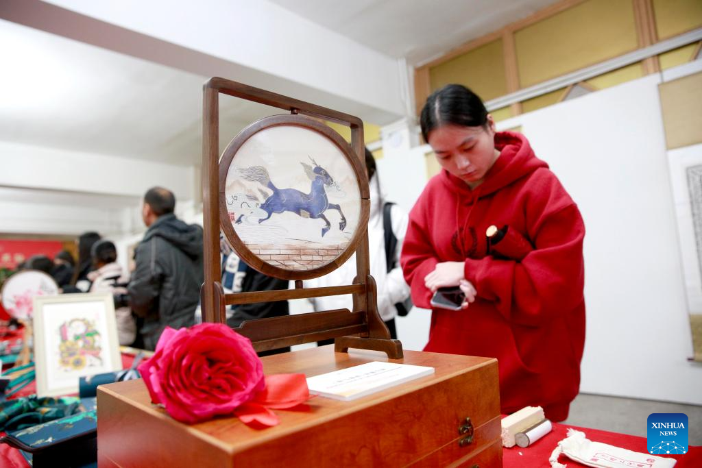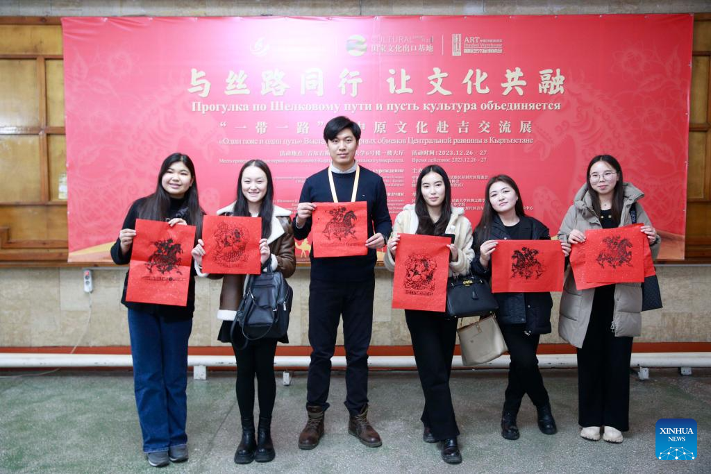 College students demonstrate their traditional Chinese New Year paintings during an exhibition of Chinese culture "Walking the Silk Road, Allowing Cultures to Integrate" in Bishkek, Kyrgyzstan, Dec. 26, 2023. An exhibition of Chinese culture "Walking the Silk Road, Allowing Cultures to Integrate," devoted to the Belt and Road Initiative (BRI) was held here recently. (Photo by Roman/Xinhua)