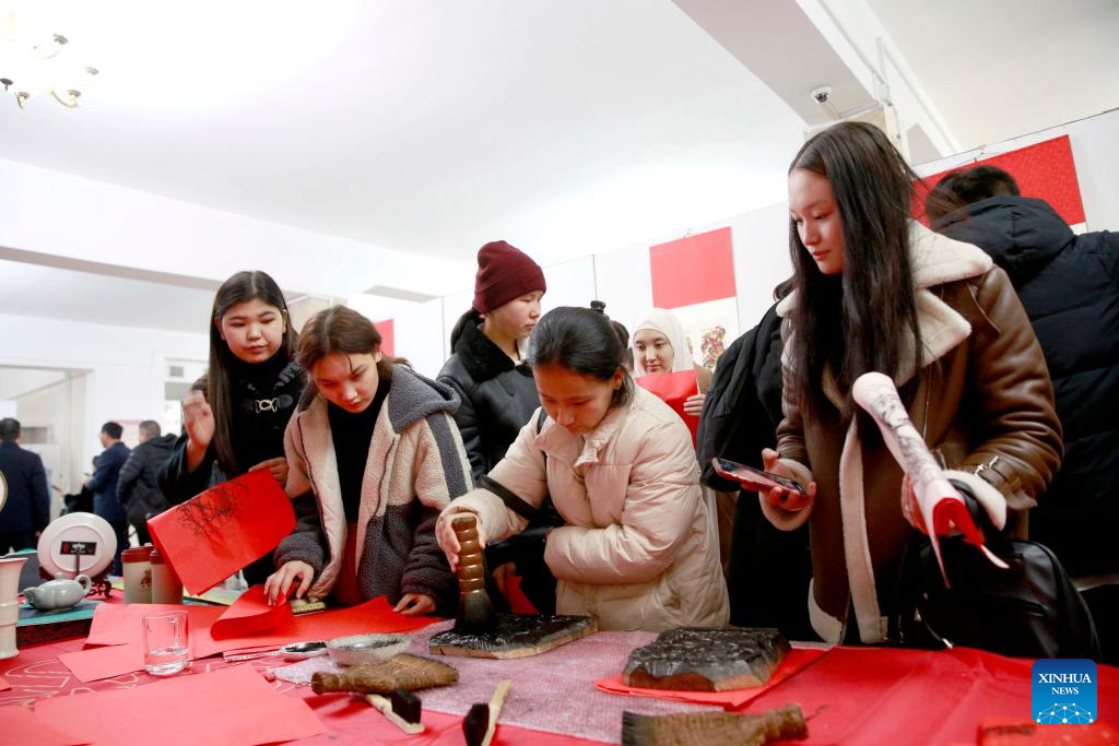 People experience Chinese culture during an exhibition of Chinese culture "Walking the Silk Road, Allowing Cultures to Integrate" in Bishkek, Kyrgyzstan, Dec. 26, 2023. An exhibition of Chinese culture "Walking the Silk Road, Allowing Cultures to Integrate," devoted to the Belt and Road Initiative (BRI) was held here recently. (Photo by Roman/Xinhua)