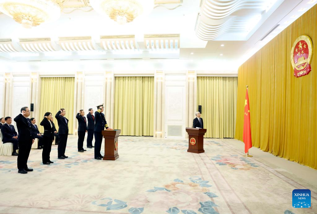 Ding Zhongli, vice chairman of the National People's Congress (NPC) Standing Committee, presides over and oversees an oath-taking ceremony held by the 14th NPC Standing Committee to pledge allegiance to the Constitution at the Great Hall of the People in Beijing, capital of China, Dec. 29, 2023. (Xinhua/Liu Weibing)