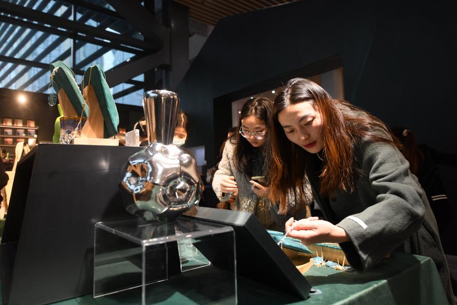 Tourists buy cultural and creative products at the Chengdu Museum in Chengdu, southwest China's Sichuan Province, Dec. 31, 2023. (Xinhua/Tang Wenhao)