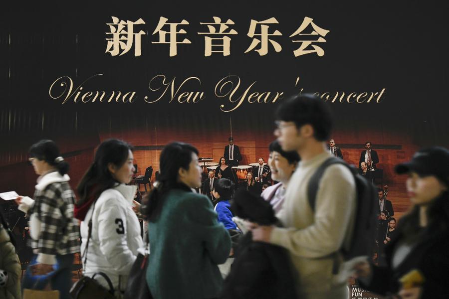 Tourists wait to enjoy a new year's concert in Chengdu, southwest China's Sichuan Province, Dec. 31, 2023. (Xinhua/Xu Bingjie)