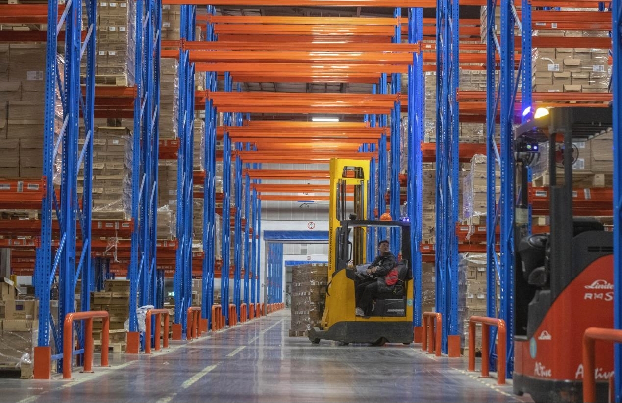 A forklift driver works in a warehouse at Jinyi Comprehensive Bonded Zone in Jinhua, east China's Zhejiang province. (Photo by Shi Kuanbing /People's Daily Online)