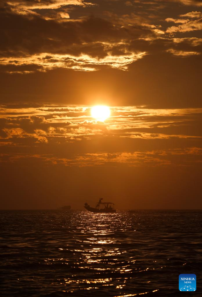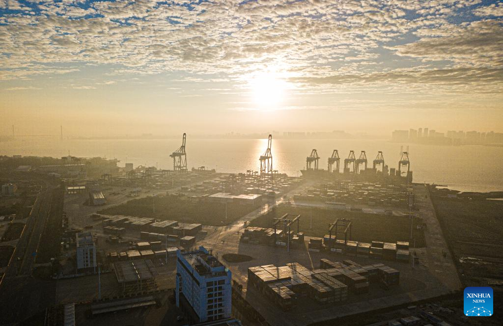 This aerial photo taken on Jan. 1, 2024 shows the sunrise at the Yangpu Economic Development Zone, south China's Hainan Province. (Xinhua/Pu Xiaoxu)