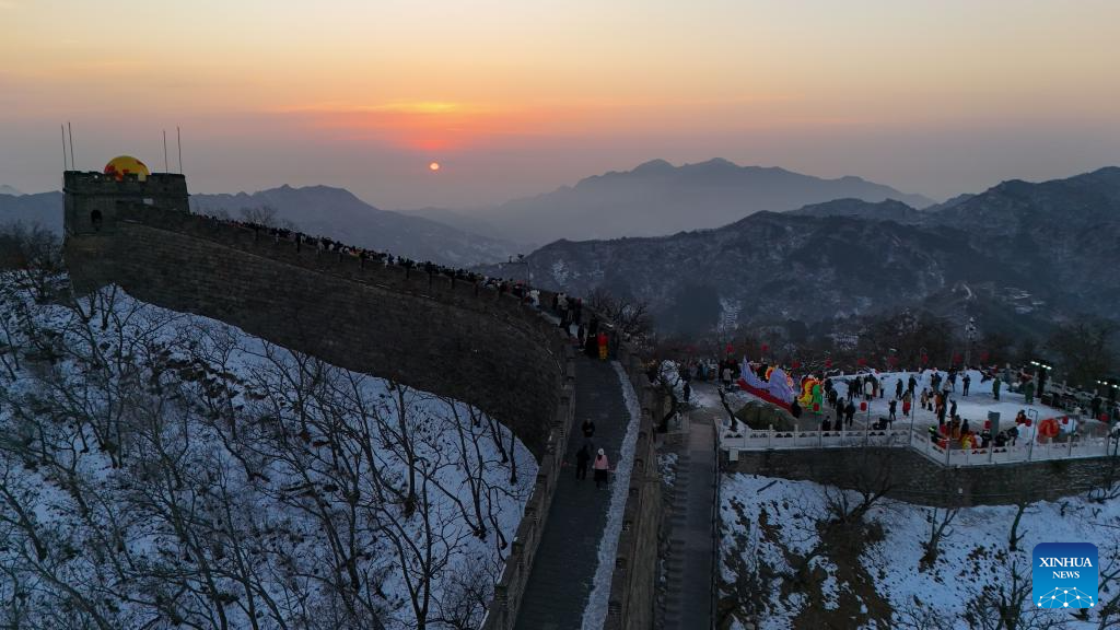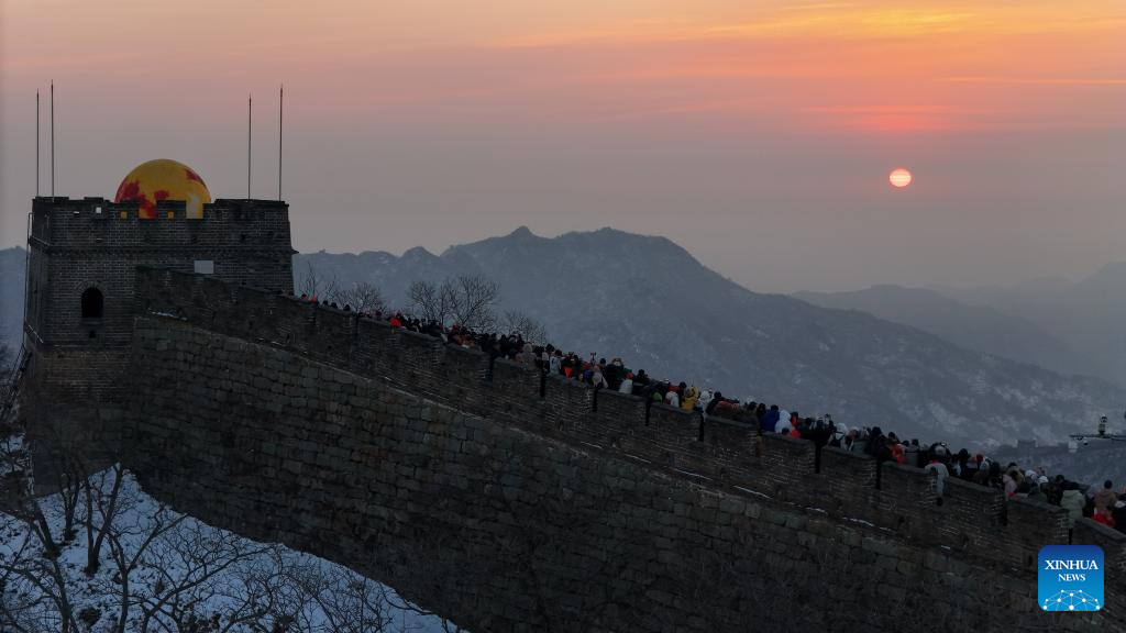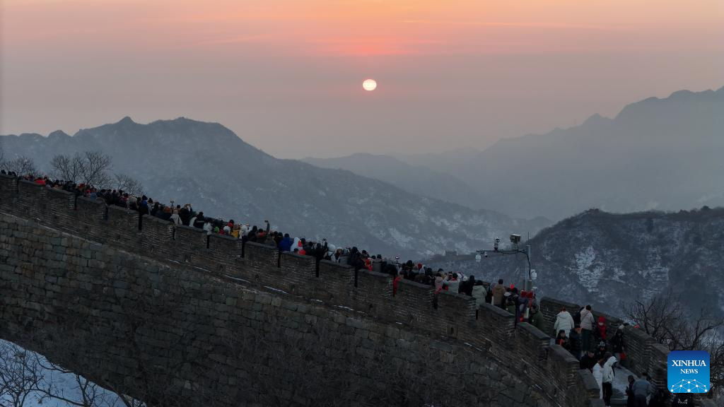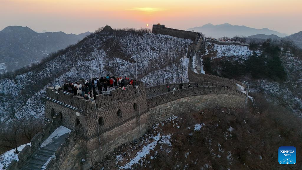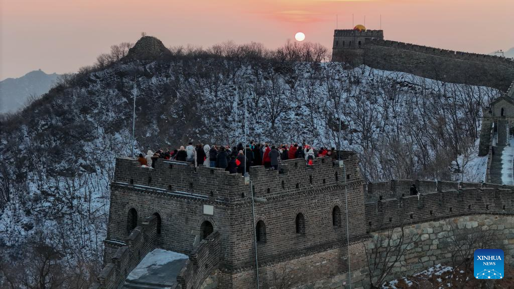 This aerial photo taken on Jan. 1, 2024 shows tourists enjoying the sunrise at the Mutianyu section of the Great Wall in Beijing, capital of China. (Xinhua/Ju Huanzong)