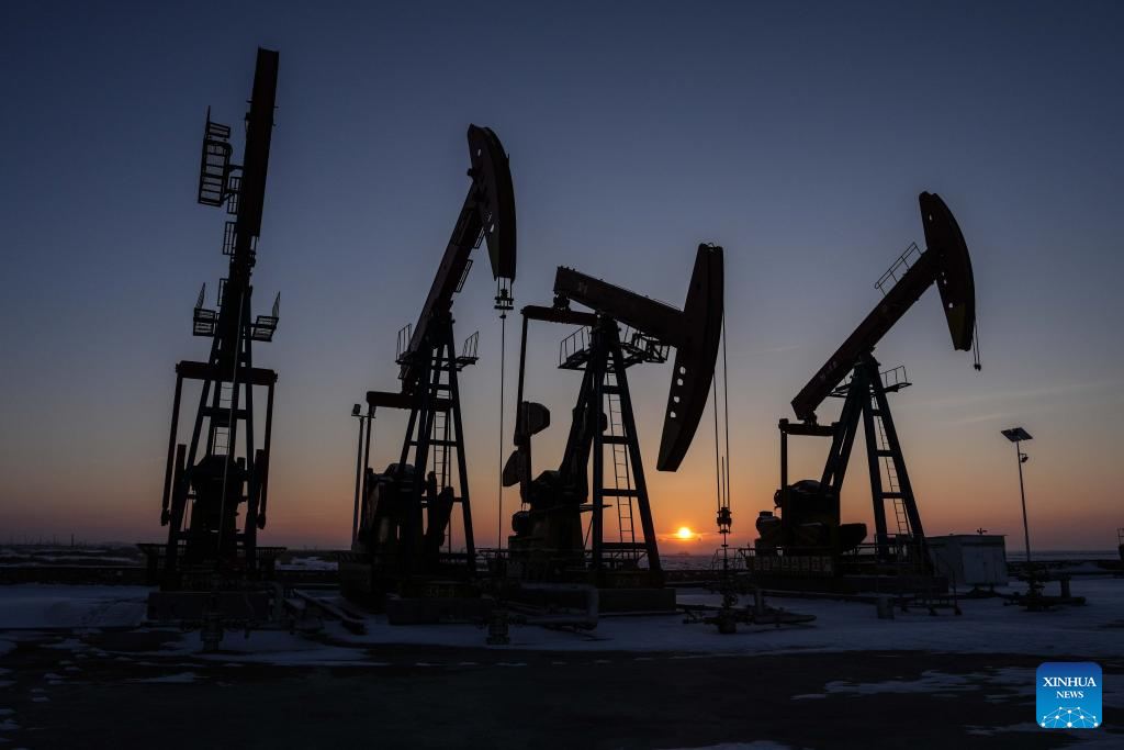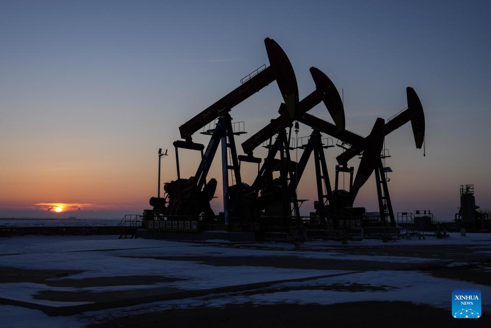 This aerial photo taken on Jan. 1, 2024 shows an oil field at sunrise in Panjin, northeast China's Liaoning Province. (Xinhua/Pan Yulong)