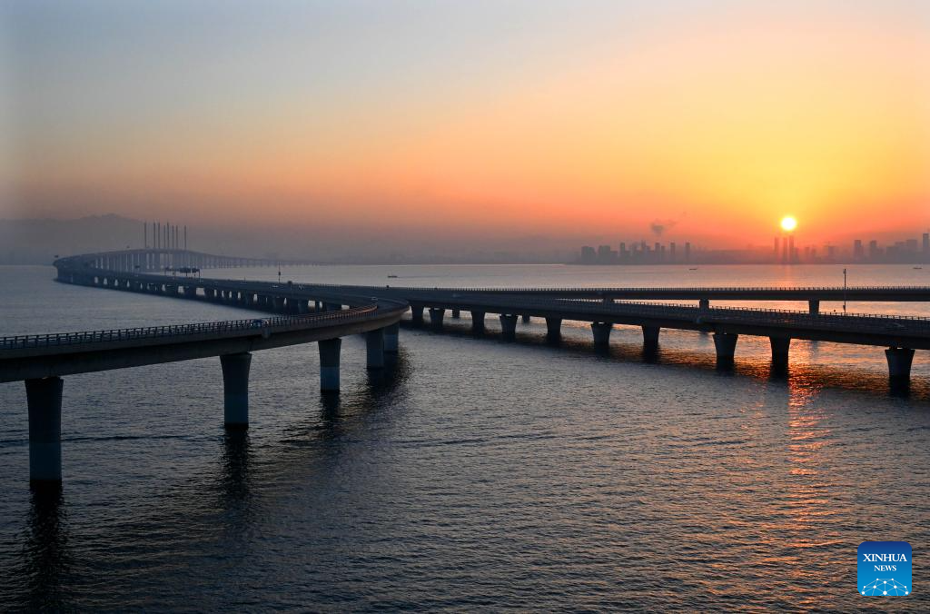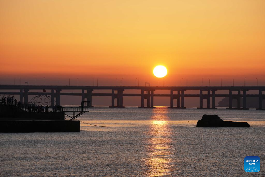 This photo shows the sunrise on the Jiaozhou Bay bridge in Qingdao, east China's Shandong Province, Jan. 1, 2024. (Xinhua/Li Ziheng)