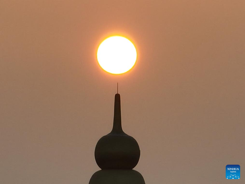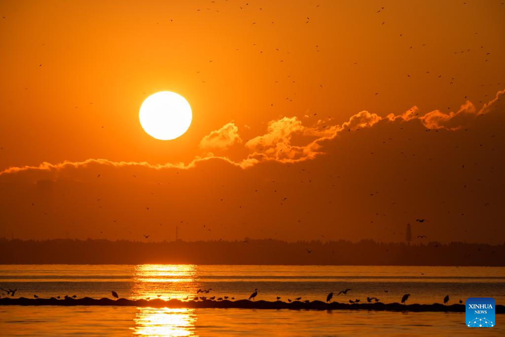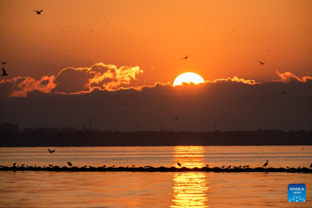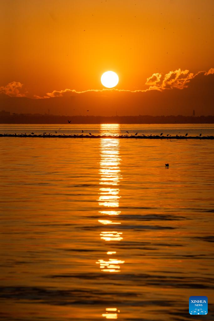 This photo taken on Jan. 1, 2024 shows the sunrise at the Dianchi Lake in Kunming, southwest China's Yunnan Province. (Xinhua/Hu Chao)