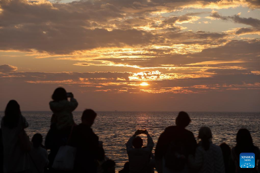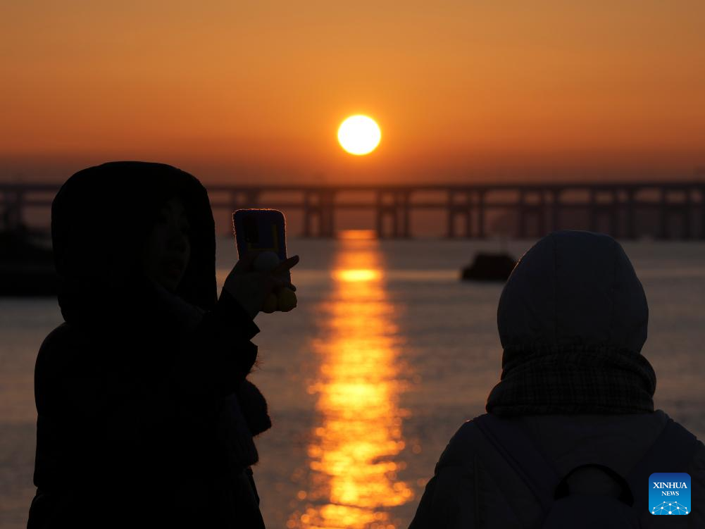 People enjoy the sunrise at the Xinghai Square in Dalian, northeast China's Liaoning Province, Jan. 1, 2024. (Xinhua/Li Gang)