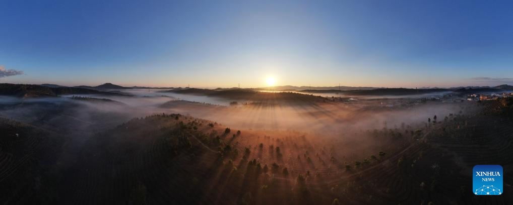 This aerial photo taken on Jan. 1, 2024 shows the sunrise at a tea garden in Jinghong City, southwest China's Yunnan Province. (Photo by Li Yunsheng/Xinhua)