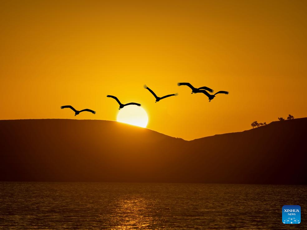 Black-necked cranes fly at sunrise at Yunnan Dashanbao National Nature Reserve in Zhaotong, southwest China's Yunnan Province, Jan. 1, 2024. (Photo by Zeng Sandong/Xinhua)