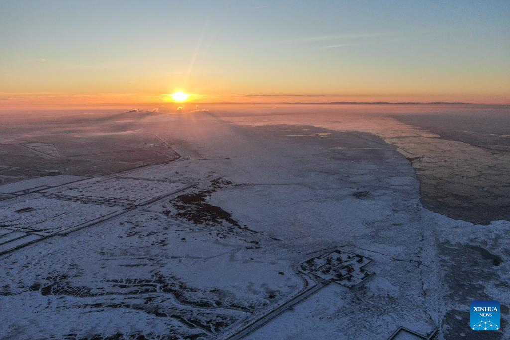 This aerial photo taken on Jan. 1, 2024 shows the sunrise in Panjin, northeast China's Liaoning Province. (Xinhua/Pan Yulong)