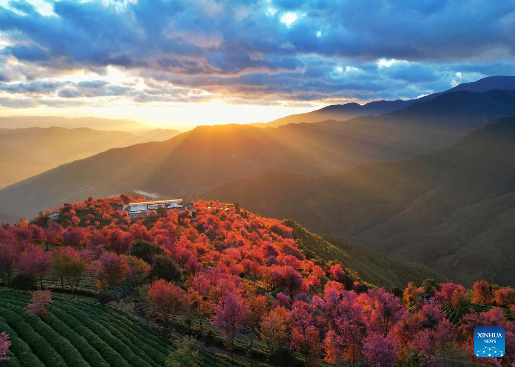 This aerial photo taken on Jan. 1, 2024 shows the sunrise at a cherry blossom scenic spot in Nanjian Yi Autonomous County, southwest China's Yunnan Province. (Photo by Shi Zhihong/Xinhua)