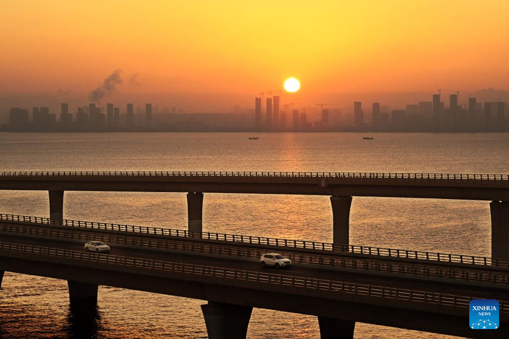 Vehicles moves on the Jiaozhou Bay bridge at sunrise in Qingdao, east China's Shandong Province, Jan. 1, 2024. (Xinhua/Li Ziheng)