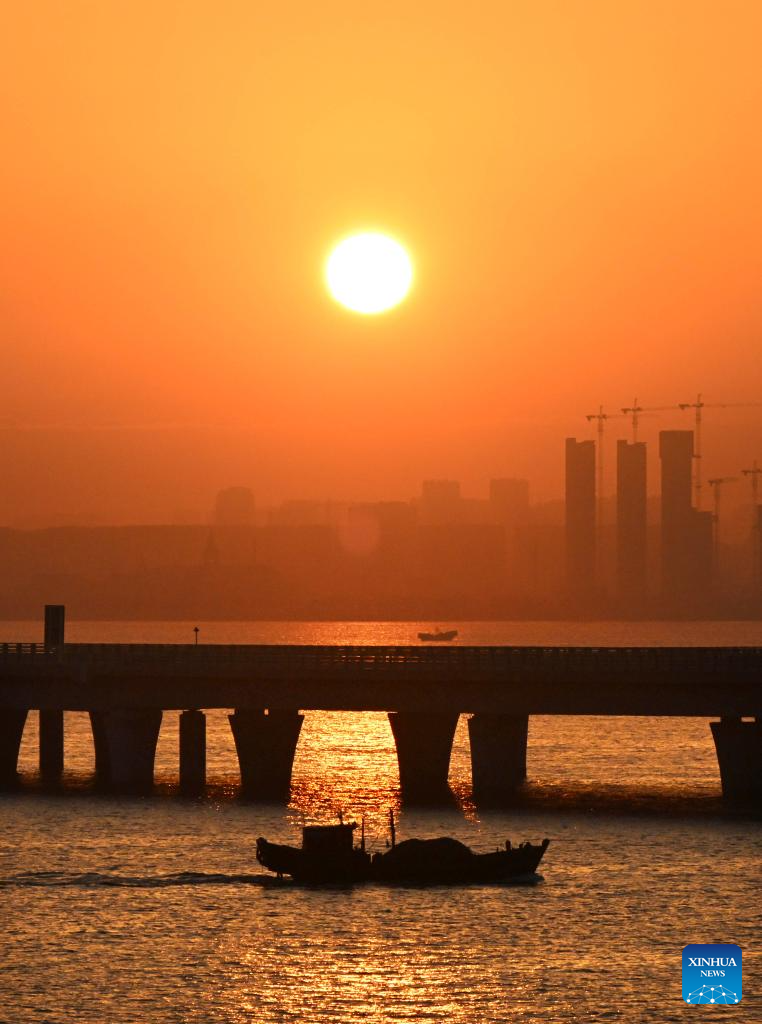 A fishing boat moves near the Jiaozhou Bay bridge at sunrise in Qingdao, east China's Shandong Province, Jan. 1, 2024. (Xinhua/Li Ziheng)
