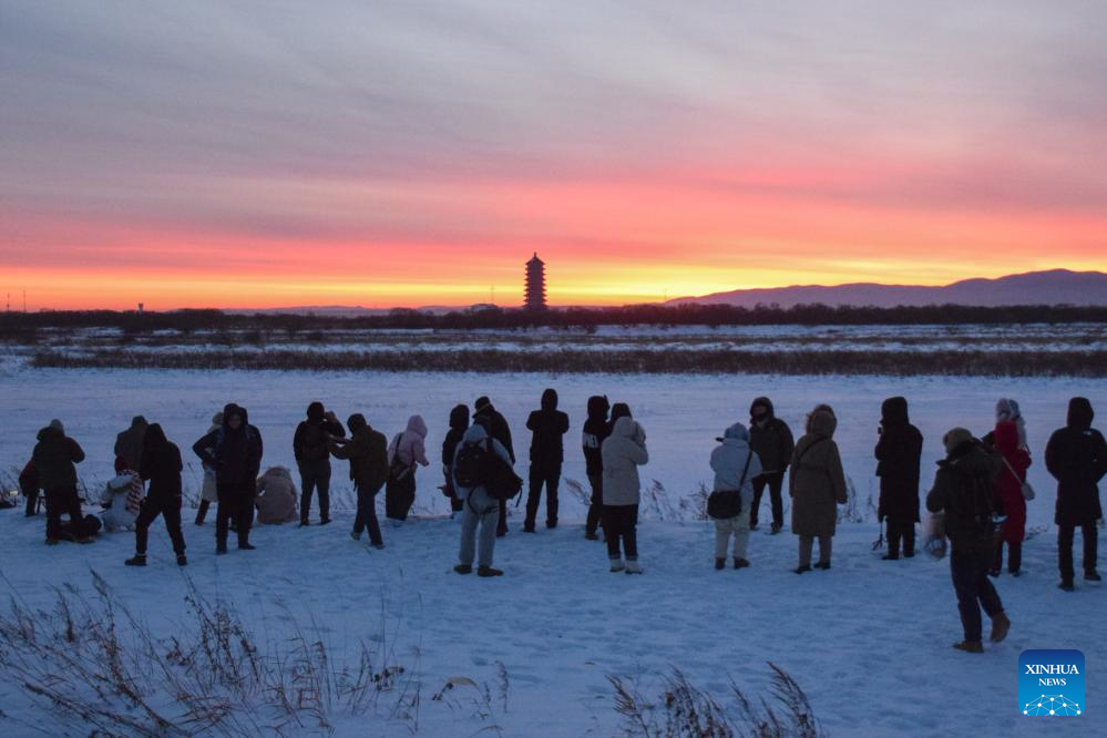 Tourists enjoy the sunrise on Heixiazi Island in Fuyuan, northeast China's Heilongjiang Province, Jan. 1, 2024. (Photo by Guan Changqing/Xinhua)