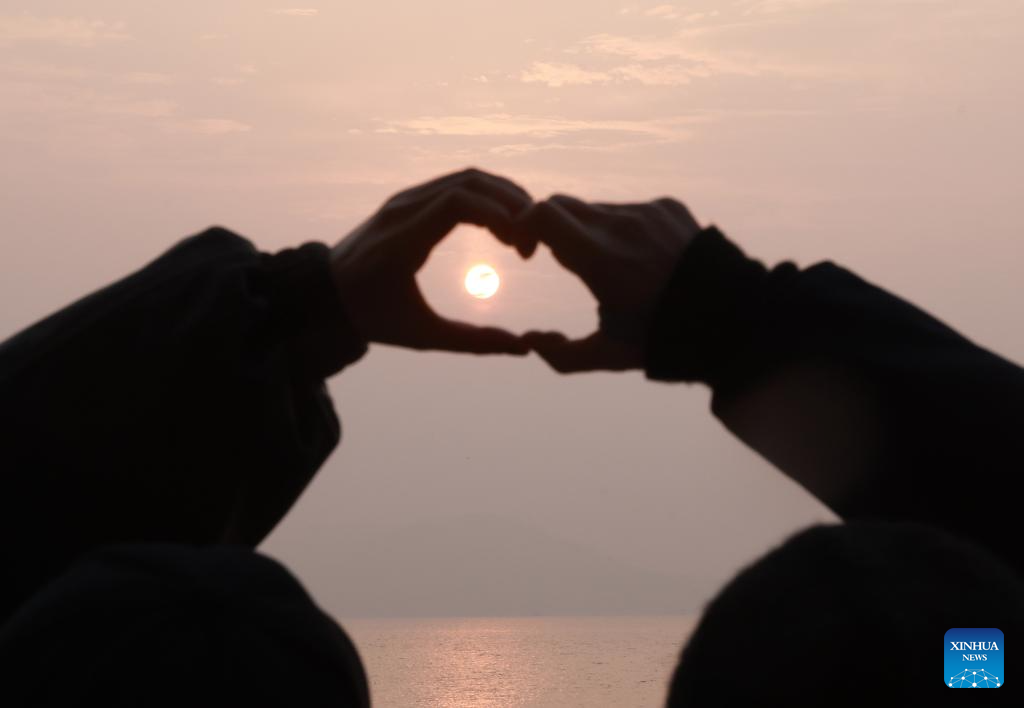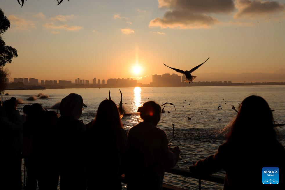 People enjoy the sunrise by Dianchi Lake in Kunming, southwest China's Yunnan Province, Jan. 1, 2024. (Photo by Zhang Zhengju/Xinhua)