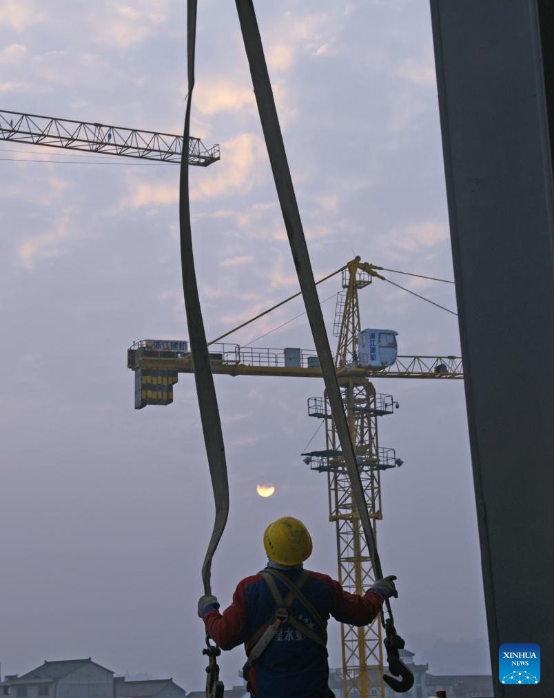A worker operates at sunrise at a high-speed railway construction site in Taizhou City, east China's Zhejiang Province, Jan. 1, 2024. (Photo by Wang Huabin/Xinhua)