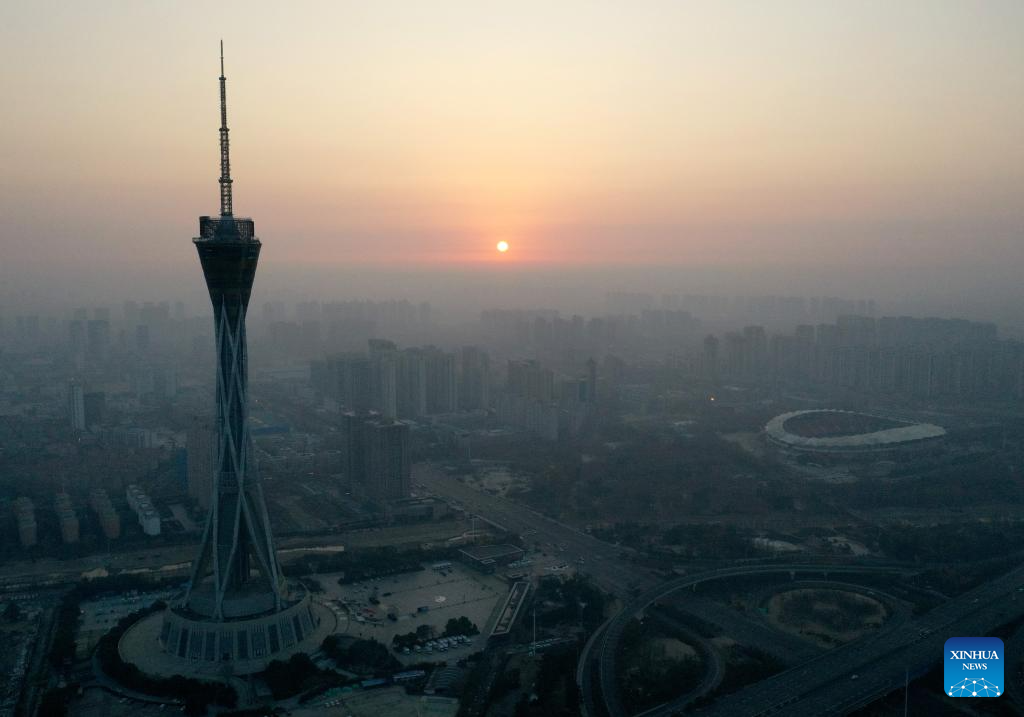 This aerial photo taken on Jan. 1, 2024 shows the sunrise near the FU Tower in Zhengzhou, central China's Henan Province. (Xinhua/Li Jianan)