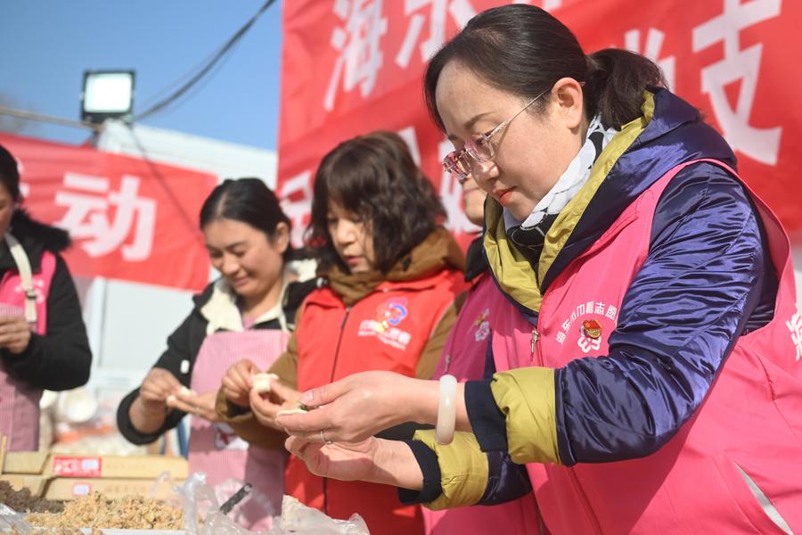 Volunteers make dumplings with villagers at a temporary relocation site in Caotan Village of Minhe Hui and Tu Autonomous County, Haidong City, northwest China's Qinghai Province, Jan. 1, 2024. (Xinhua/Zhang Long)