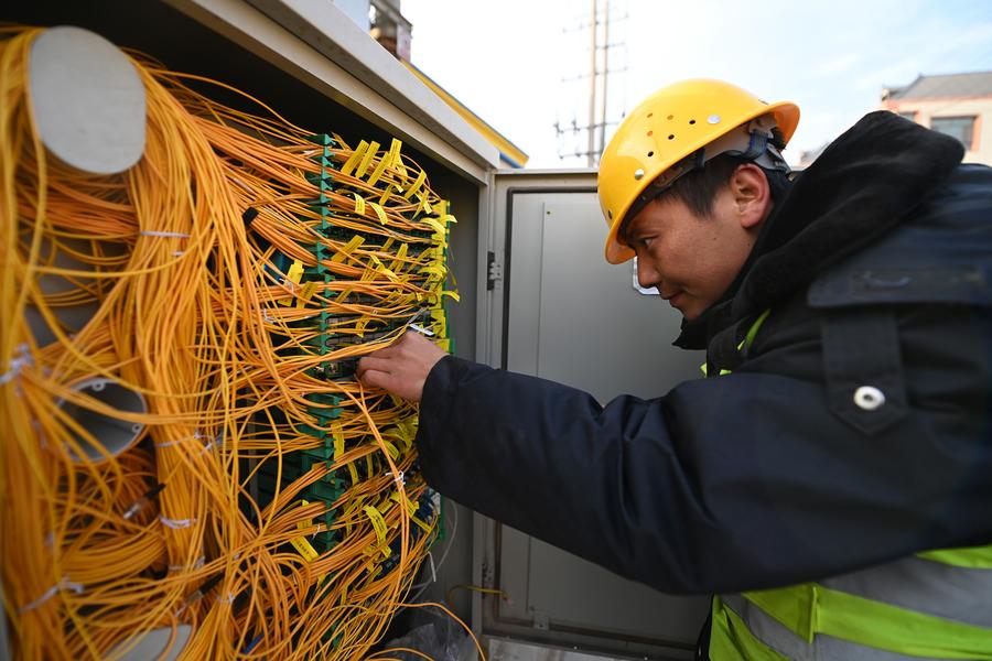 A technician works on fiber-optic cables for prefabricated houses at a temporary relocation site in Dahe Village of Dahejia Township, Jishishan County, northwest China's Gansu Province, Jan. 1, 2024. (Xinhua/Fan Peishen)