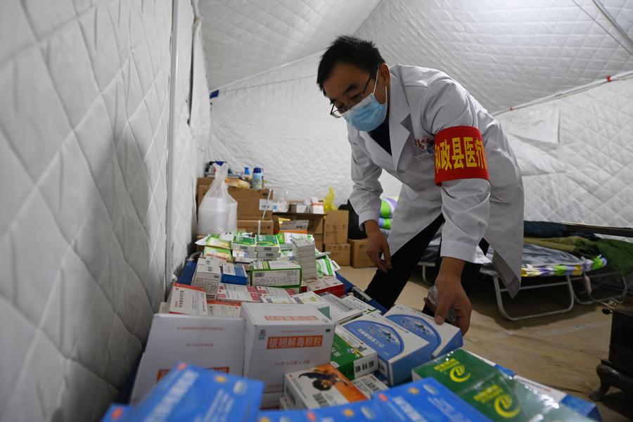 Wang Ming, a member of a medical team, sorts medicines at a temporary relocation site in Shenjiaping Village of Shiyuan Township, Jishishan County, northwest China's Gansu Province, Jan. 1, 2024. (Xinhua/Fan Peishen)