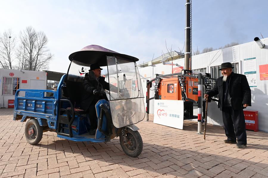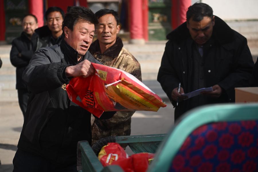 Villagers transport relief supplies at a temporary relocation site in Caotan Village of Minhe Hui and Tu Autonomous County, Haidong City, northwest China's Qinghai Province, Jan. 1, 2024. (Xinhua/Zhang Long)