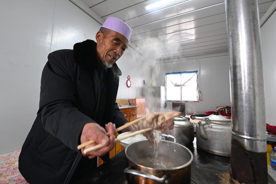 A villager cooks in a prefabricated house at a temporary relocation site in Kexinmin Village of Dahejia Township, Jishishan County, northwest China's Gansu Province, Jan. 1, 2024. (Xinhua/Fan Peishen)