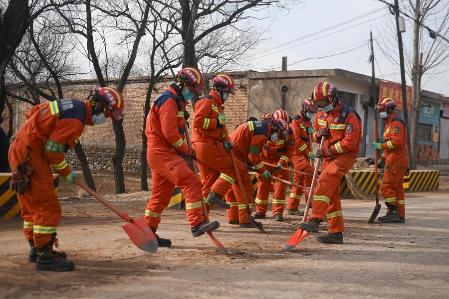 Firefighters clean a road at a temporary relocation site in Caotan Village of Minhe Hui and Tu Autonomous County, Haidong City, northwest China's Qinghai Province, Jan. 1, 2024. (Xinhua/Zhang Long)