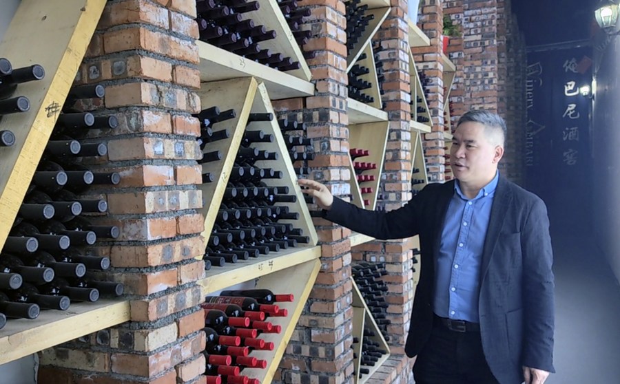 Zhang Xinguo, head of the Xinjiang Jiuping Import and Export Co., Ltd., presents imported wine at a wine cellar in Urumqi, northwest China's Xinjiang Uygur Autonomous Region, Dec. 22, 2023. (Xinhua/Pan Ying)
