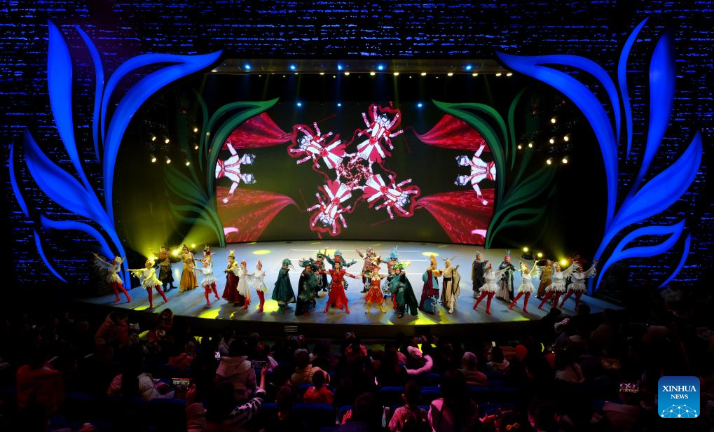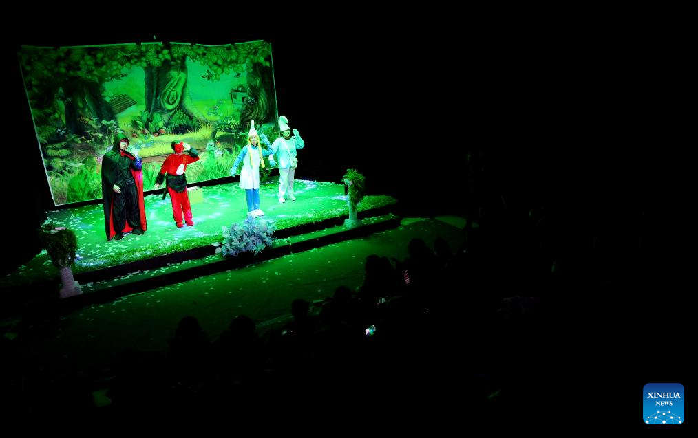 Artists perform a child play at a theater in Xi'an, northwest China's Shaanxi Province, Dec. 31, 2023. Dramas, concerts and shows for children were staged during the New Year holiday in the northwestern city of Xi'an. (Xinhua/Liu Xiao)