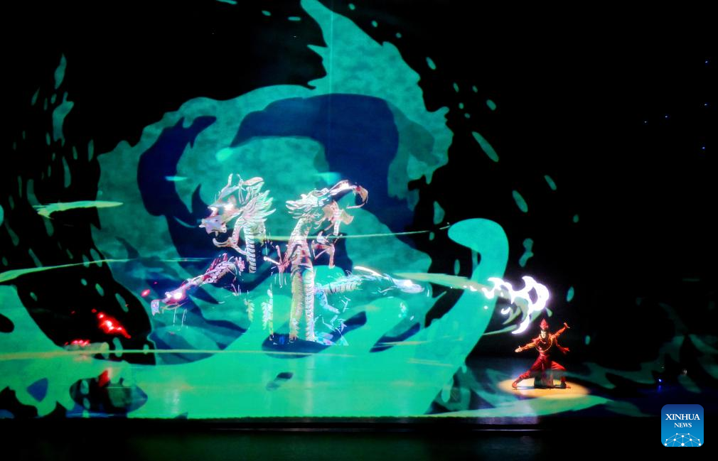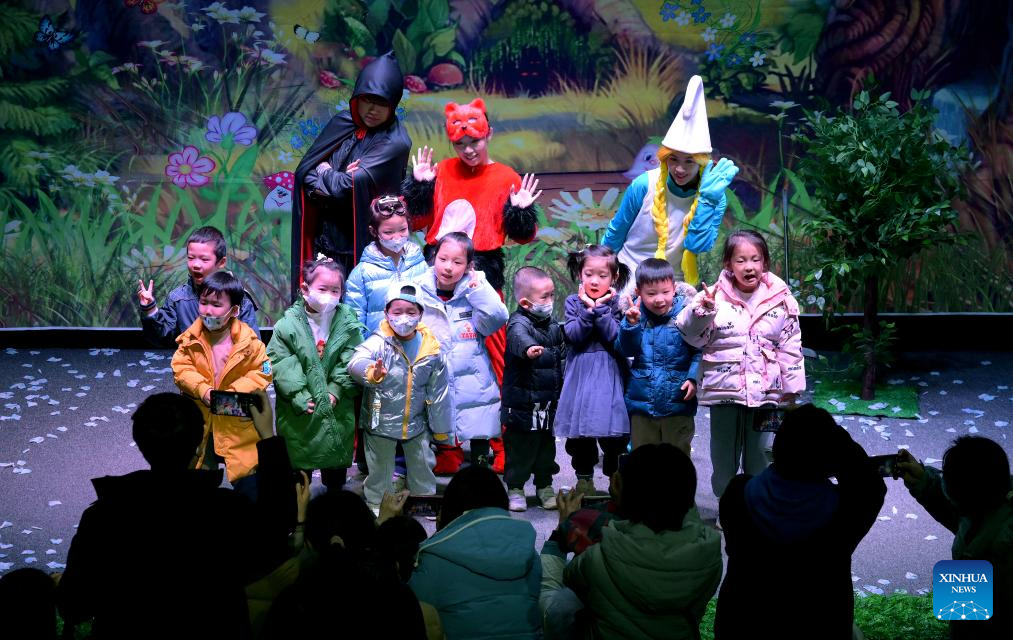 Artists perform a child play at a theater in Xi'an, northwest China's Shaanxi Province, Jan. 1, 2024. Dramas, concerts and shows for children were staged during the New Year holiday in the northwestern city of Xi'an. (Xinhua/Liu Xiao)