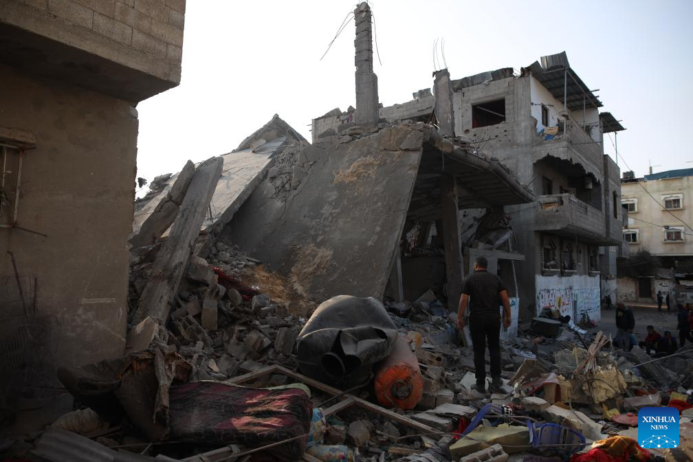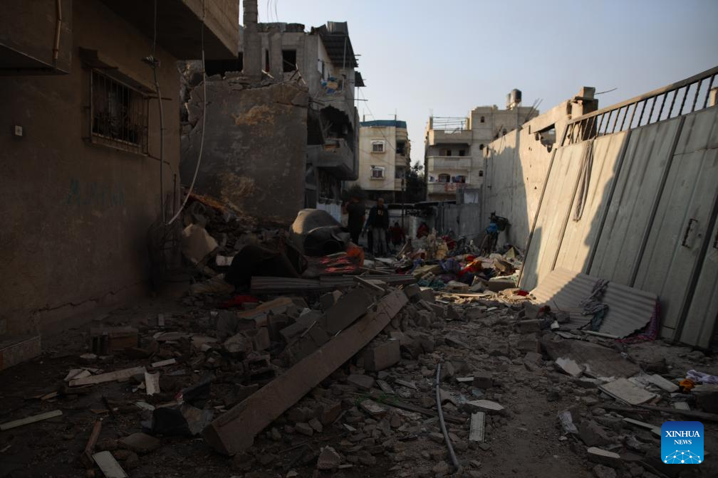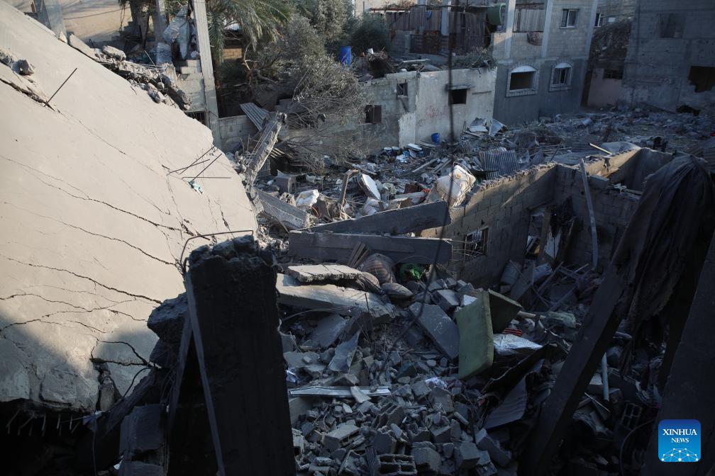 People check on a damaged house after an Israeli airstrike in Maghazi refugee camp in central Gaza Strip, on Jan. 1, 2024. The death toll of Palestinians has risen to 21,978 after the outbreak of the Israel-Hamas conflict on Oct. 7, the Hamas-run Health Ministry said on Monday. (Xinhua)