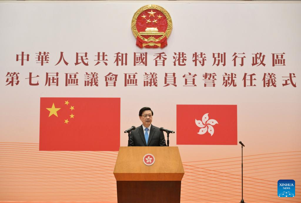 Chief Executive of the Hong Kong Special Administrative Region (HKSAR) John Lee addresses the oath-taking ceremony for newly-elected members of the seventh-term District Councils (DCs) of the HKSAR, in Hong Kong, south China, Jan. 1, 2024. All 470 newly-elected members of the seventh-term District Councils (DCs) of the HKSAR on Monday took oaths to uphold the Basic Law of the HKSAR and bear allegiance to the HKSAR, and assumed office. (Xinhua)