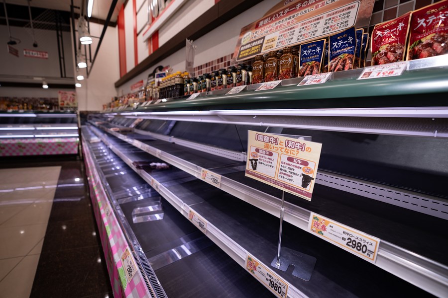 This photo taken on Jan. 2, 2024 shows an almost vacant food shelf at a supermarket in Hakui, Ishikawa, Japan. (Xinhua/Zhang Xiaoyu)