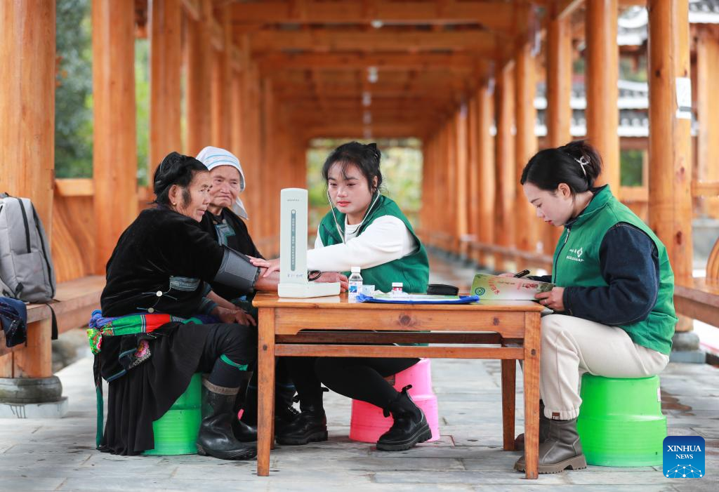 A family doctor measures a villager's blood pressure in Gangbian Village of Congjiang County, southwest China's Guizhou Province, Jan. 2, 2024. Workers around China have returned to their respective posts after the New Year holiday. (Photo by Luo Jinglai/Xinhua)