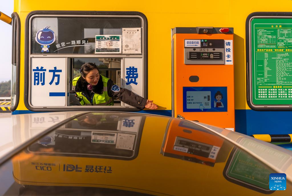 A staff member gestures as a car passes an expressway toll gate in east China's Zhejiang Province, Jan. 2, 2024. Workers around China have returned to their respective posts after the New Year holiday. (Photo by Long Wei/Xinhua)