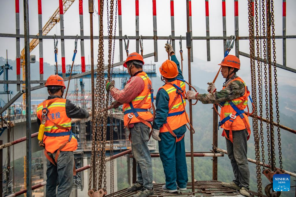 Workers are busy at the construction site of an expressway bridge in southwest China's Yunnan Province, Jan. 2, 2024. Workers around China have returned to their respective posts after the New Year holiday. (Photo by Xiong Pingxiang/Xinhua)