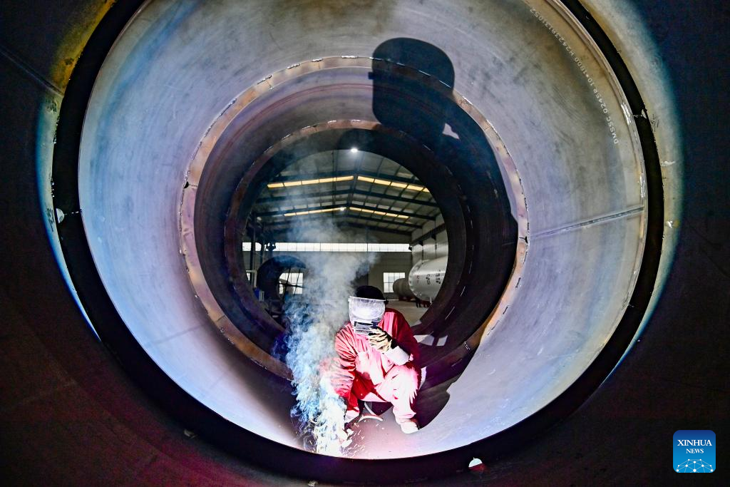 A worker performs a welding task at a workshop in Qingzhou City, east China's Shandong Province, Jan. 2, 2024. Workers around China have returned to their respective posts after the New Year holiday. (Photo by Wang Jilin/Xinhua)