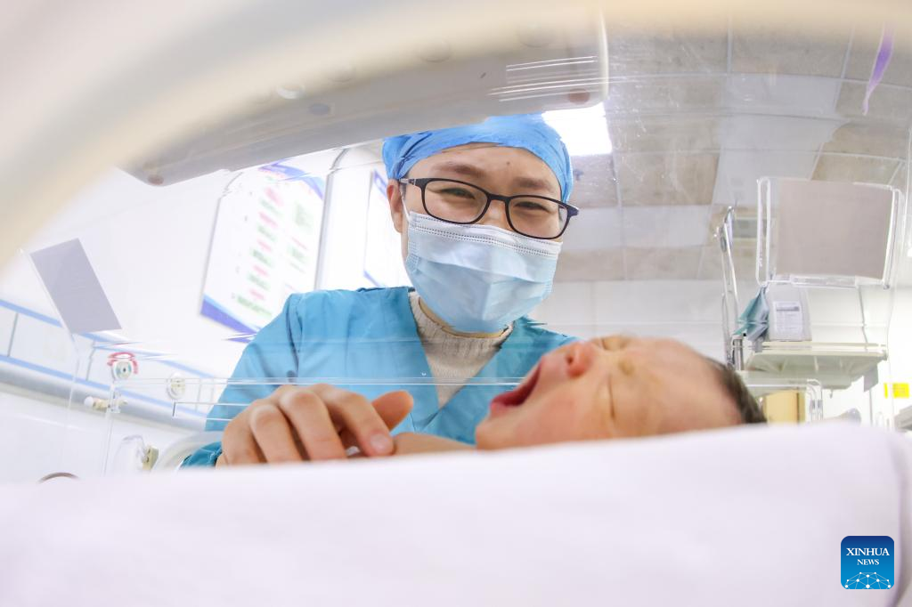 A medical worker tends a newborn baby at a hospital in Yuping Dong Autonomous County of Tongren City, southwest China's Guizhou Province, Jan. 2, 2024. Workers around China have returned to their respective posts after the New Year holiday. (Photo by Hu Panxue/Xinhua)