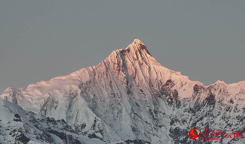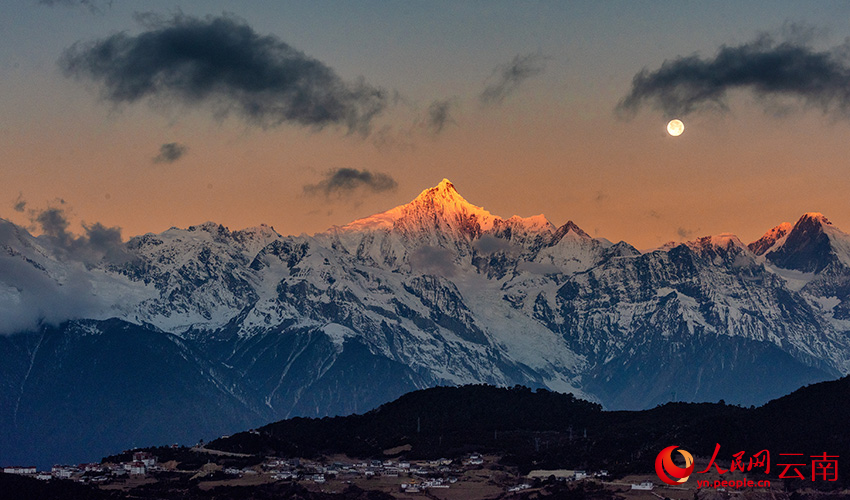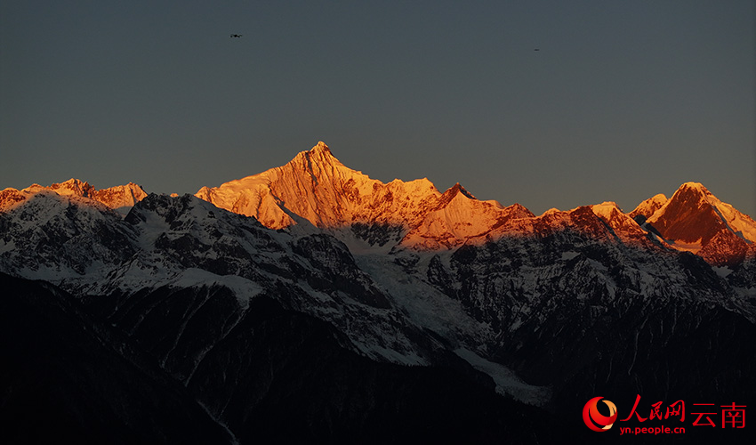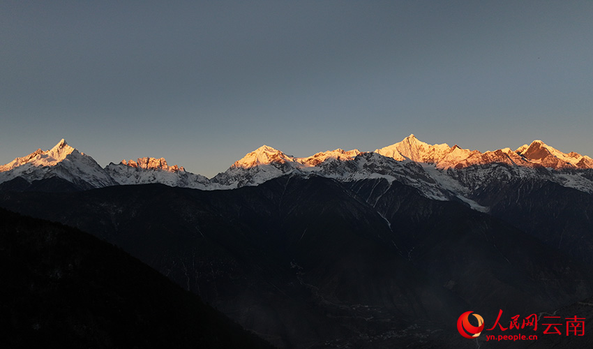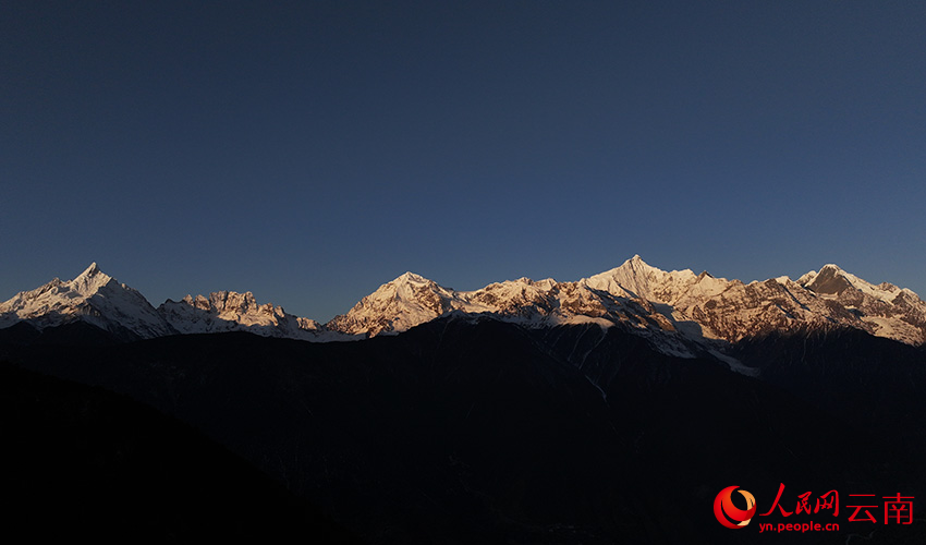 The initial break of sunlight casts an ethereal glow on the peaks of the Meili Snow Mountains in southwest China's Yunnan Province. (Photo/Li Chunlei)