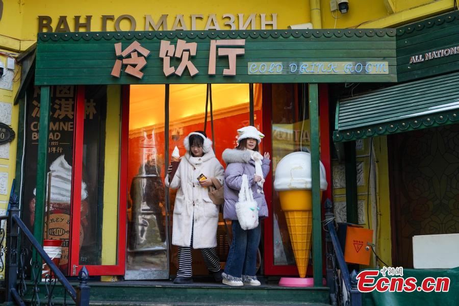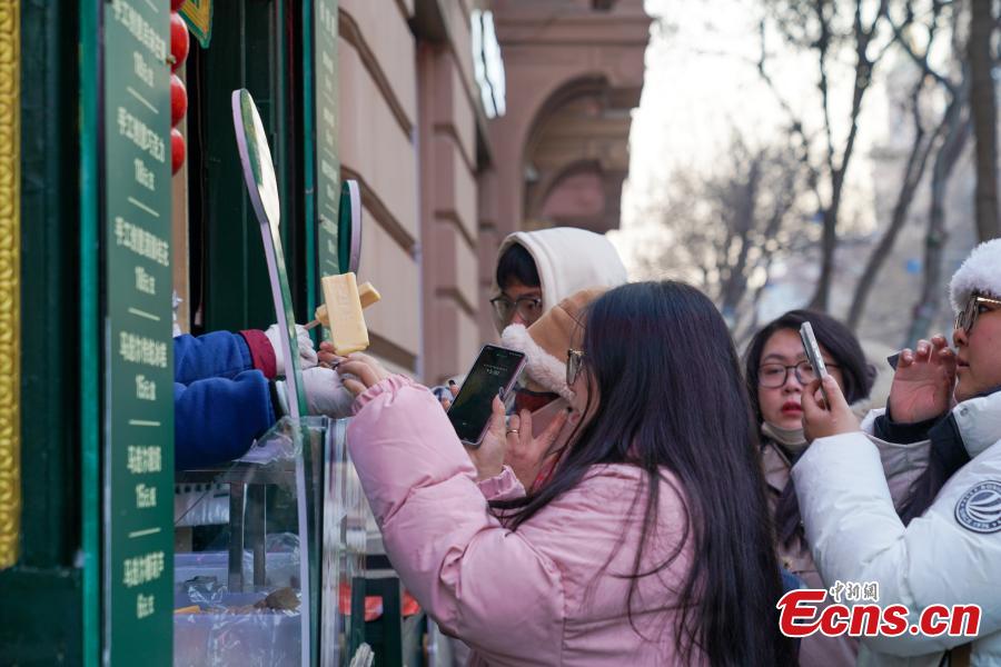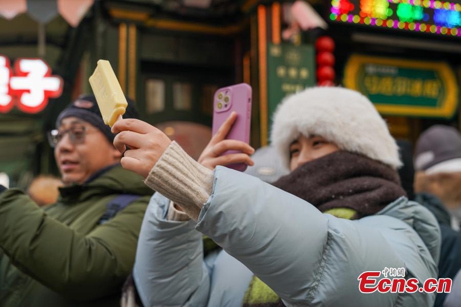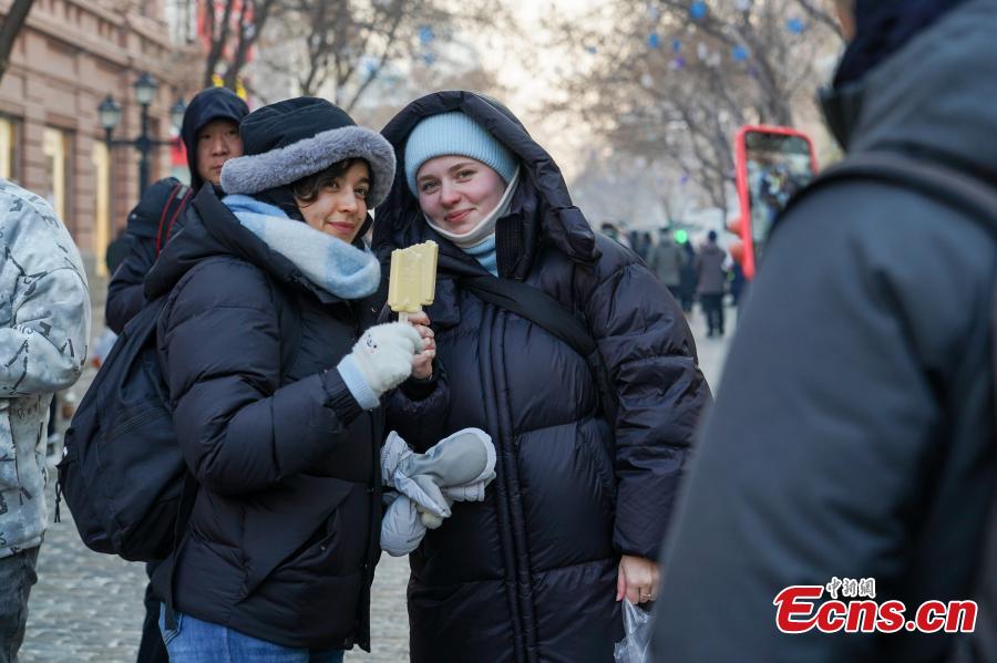 Eating ice cream or ice lollipop has become a delight among tourists in winter Harbin.